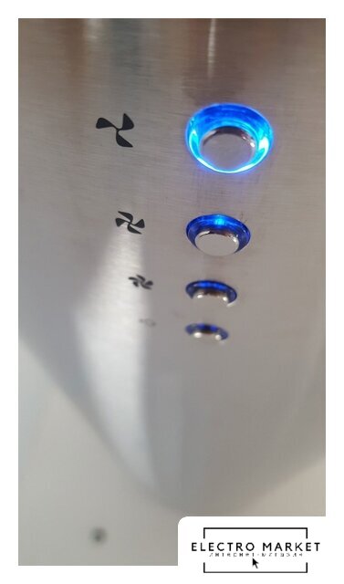 конструкция Т-образная, монтаж островной, ширина 90 см, управление сенсорное, производительность вытяжки 950 м³/ч, цвет нержавеющая сталь/черный