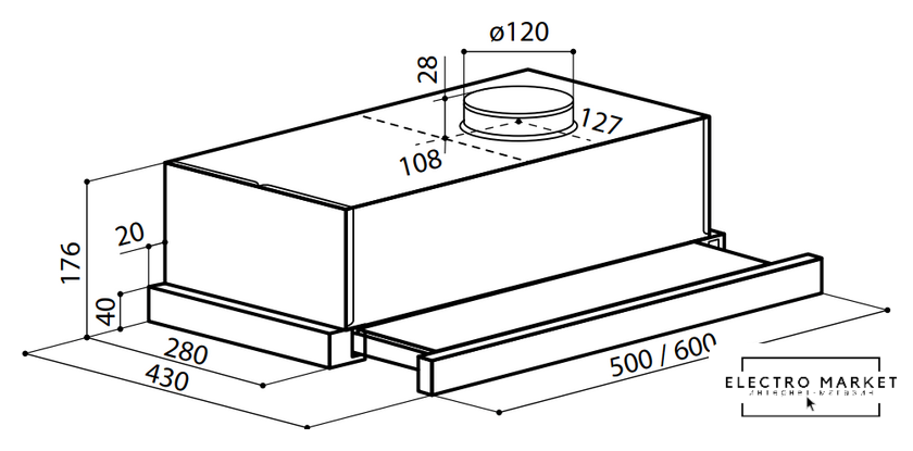 конструкция телескопическая, монтаж для встраивания, ширина 60 см, управление механическое/кнопочное, производительность мотора 520 м³/ч, цвет белый