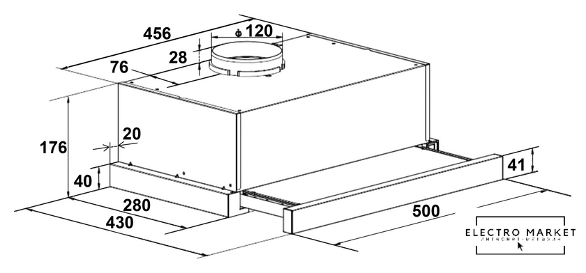 конструкция купольная, монтаж настенный, управление механическое/кнопочное, производительность мотора 430 м³/ч, ширина 50 см