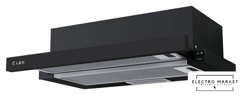 конструкция скрытая, монтаж для встраивания, ширина 59.8 см, управление механическое/кнопочное, производительность мотора 750 м³/ч, цвет черный