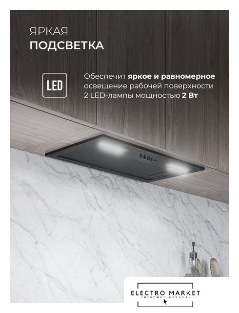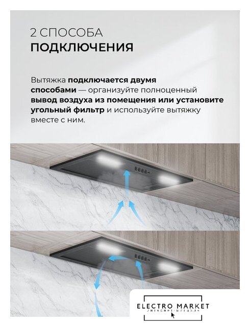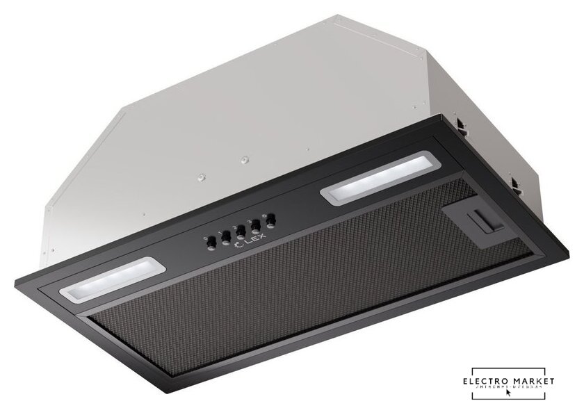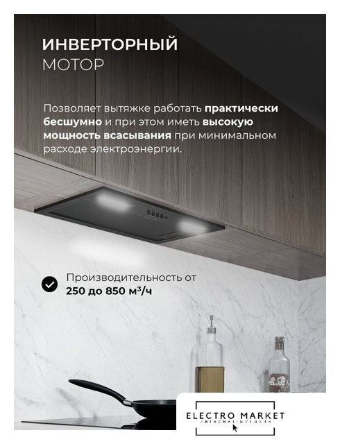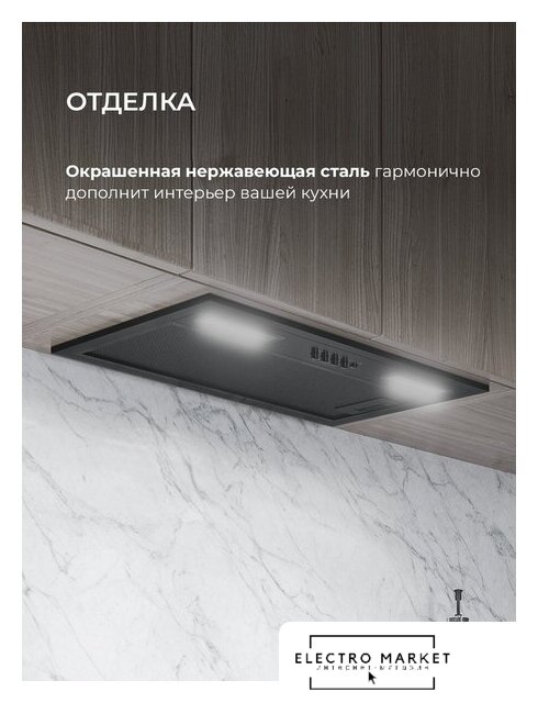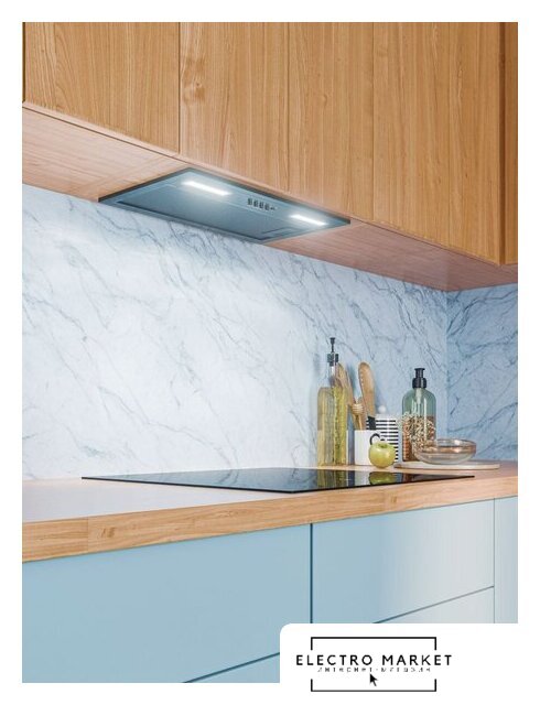 конструкция скрытая, монтаж для встраивания, ширина 52 см, управление механическое/кнопочное, производительность мотора 850 м³/ч, цвет серый