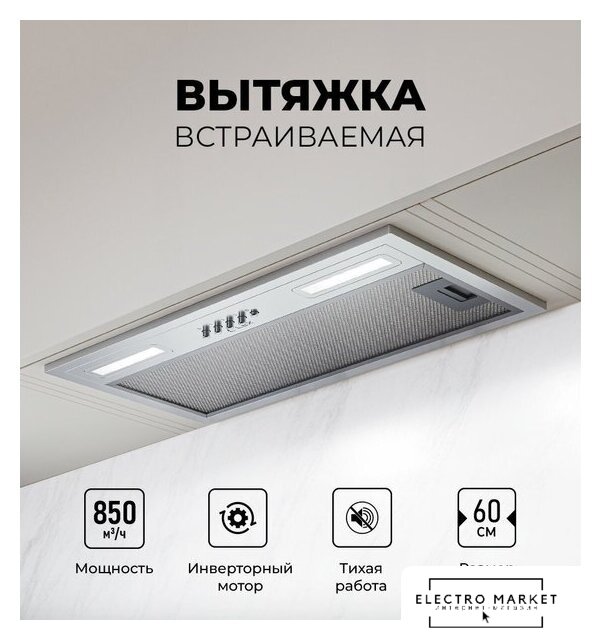 конструкция скрытая, монтаж для встраивания, ширина 60 см, управление механическое/кнопочное, производительность вытяжки 1000 м³/ч, цвет белый