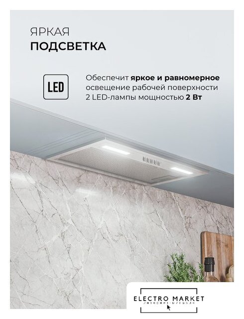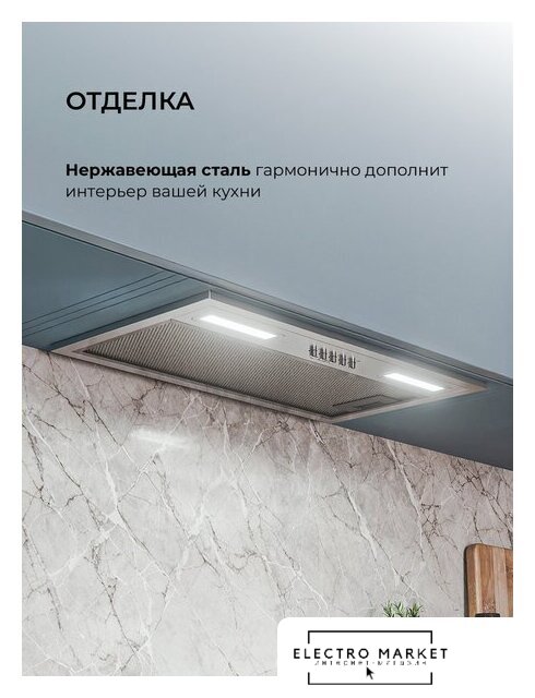 конструкция телескопическая, монтаж для встраивания, управление механическое/слайдерное, производительность мотора 600 м³/ч, ширина 50 см