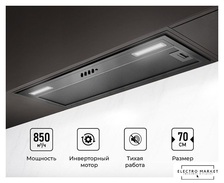 конструкция скрытая, монтаж для встраивания, ширина 59.8 см, управление механическое/кнопочное, производительность мотора 1050 м³/ч, цвет нержавеющая сталь