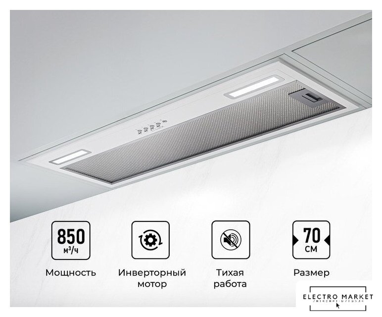 конструкция скрытая, монтаж для встраивания, ширина 60 см, управление сенсорное, производительность мотора 850 м³/ч, цвет белый