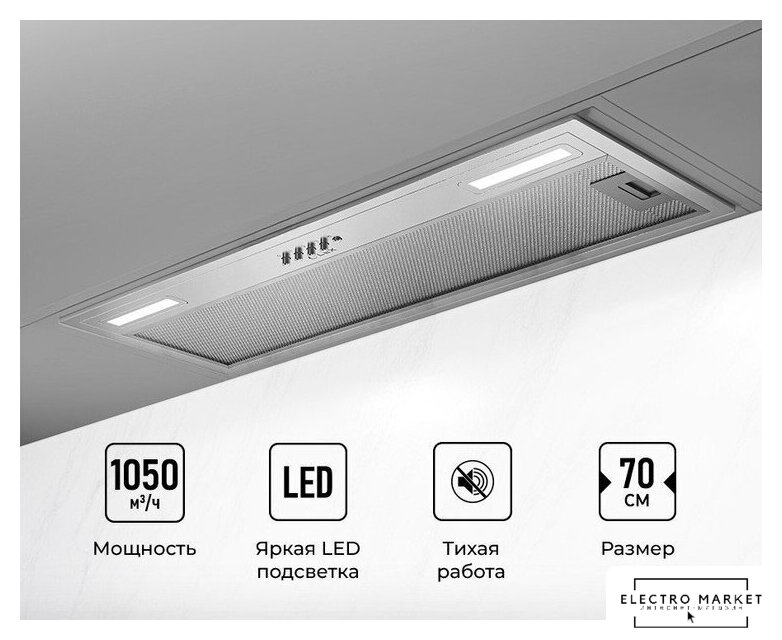 конструкция скрытая, монтаж для встраивания, ширина 52 см, управление механическое/кнопочное, производительность мотора 1010 м³/ч, цвет белый
