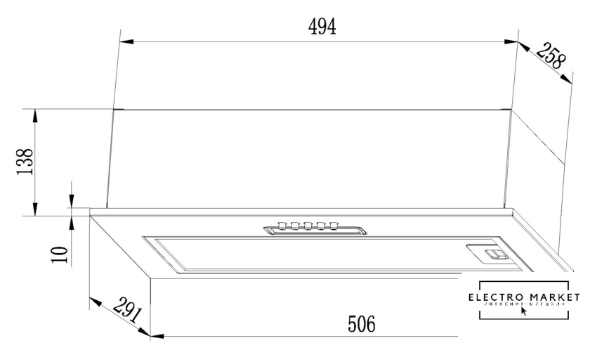 конструкция скрытая, монтаж для встраивания, ширина 59.8 см, управление механическое/кнопочное, производительность мотора 1000 м³/ч, цвет черный