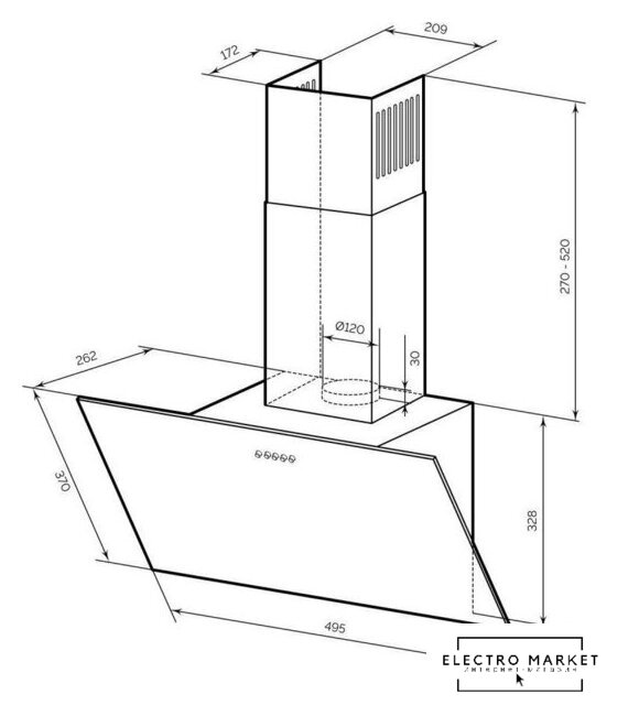 конструкция Т-образная, монтаж настенный, управление механическое/кнопочное, производительность мотора 430 м³/ч, ширина 60 см