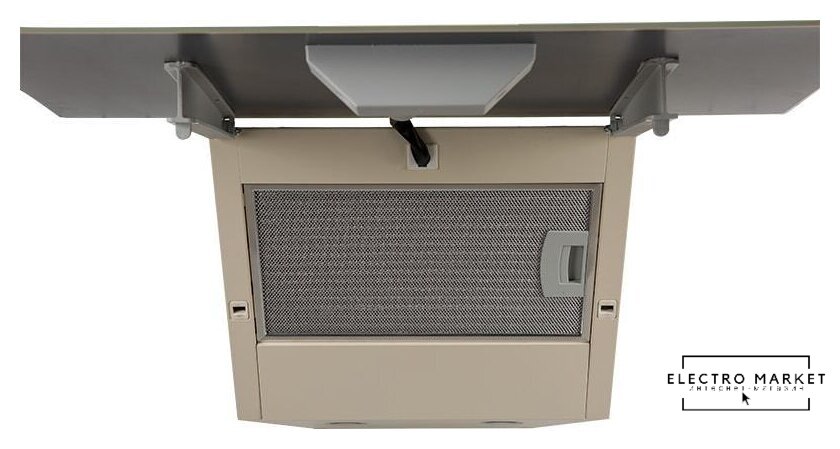 конструкция телескопическая, монтаж для встраивания, ширина 59.8 см, управление механическое/кнопочное, производительность вытяжки 336 м³/ч, производительность мотора 650 м³/ч, цвет белый/серый
