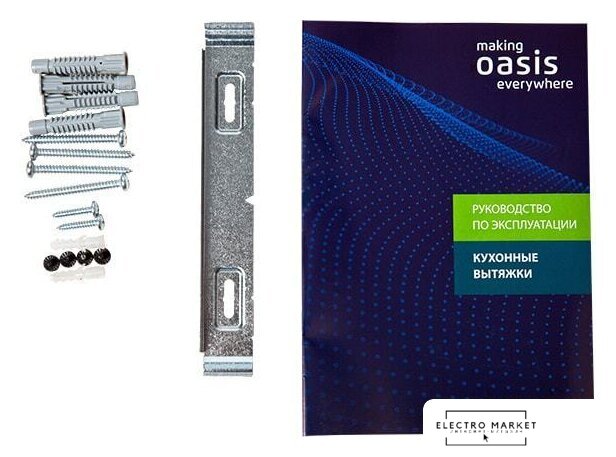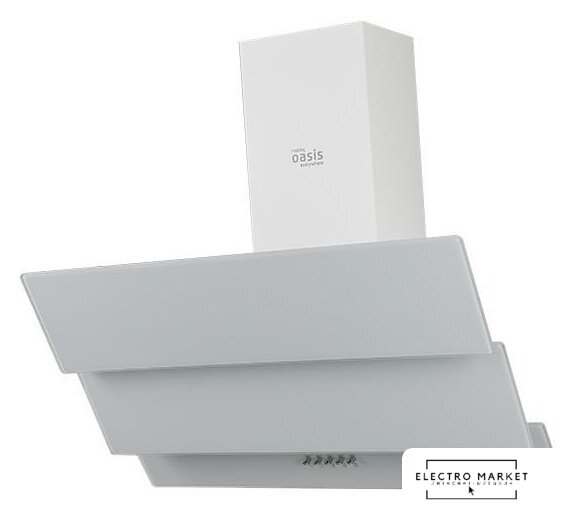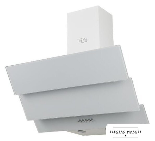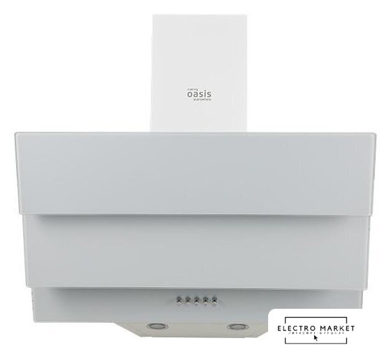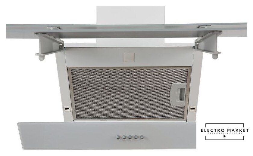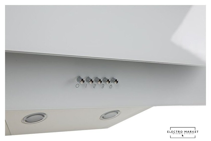 конструкция Т-образная, монтаж настенный, ширина 59 см, управление механическое/кнопочное, производительность мотора 430 м³/ч, цвет белый