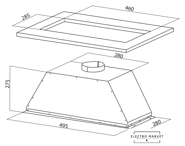 конструкция наклонная, монтаж настенный, ширина 60 см, управление механическое/кнопочное, производительность мотора 850 м³/ч, цвет нержавеющая сталь/черный