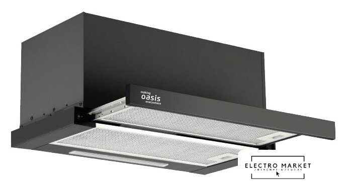 конструкция телескопическая, монтаж для встраивания, ширина 59.5 см, управление механическое/кнопочное, производительность мотора 550 м³/ч, цвет нержавеющая сталь