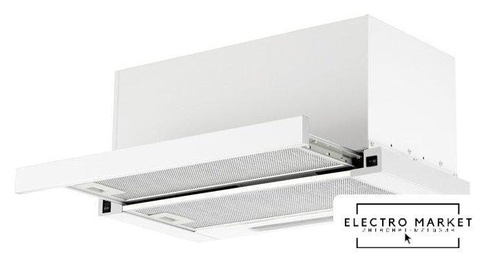 конструкция скрытая, монтаж для встраивания, ширина 52 см, управление механическое/кнопочное, производительность мотора 650 м³/ч, цвет белый