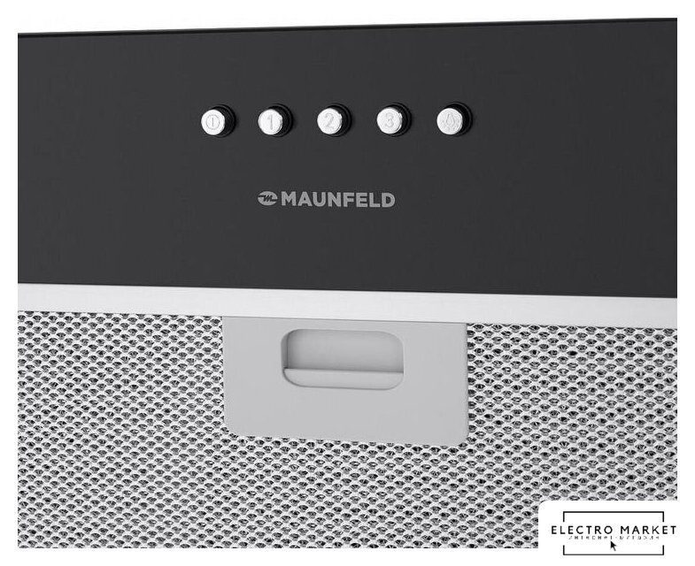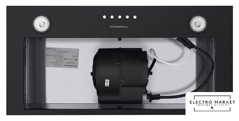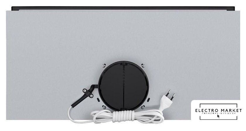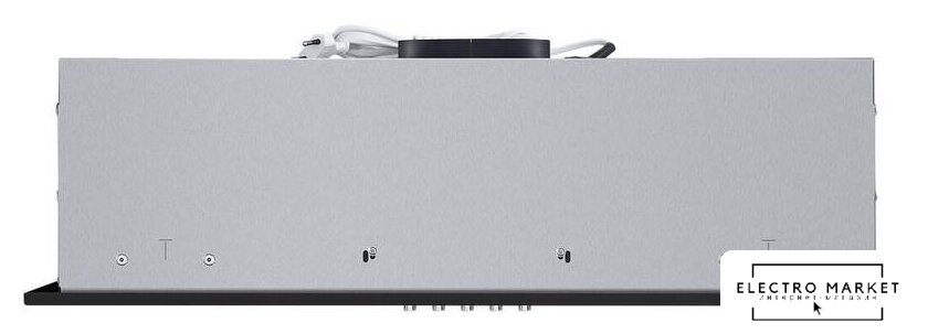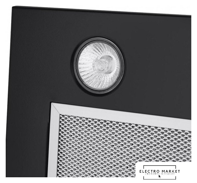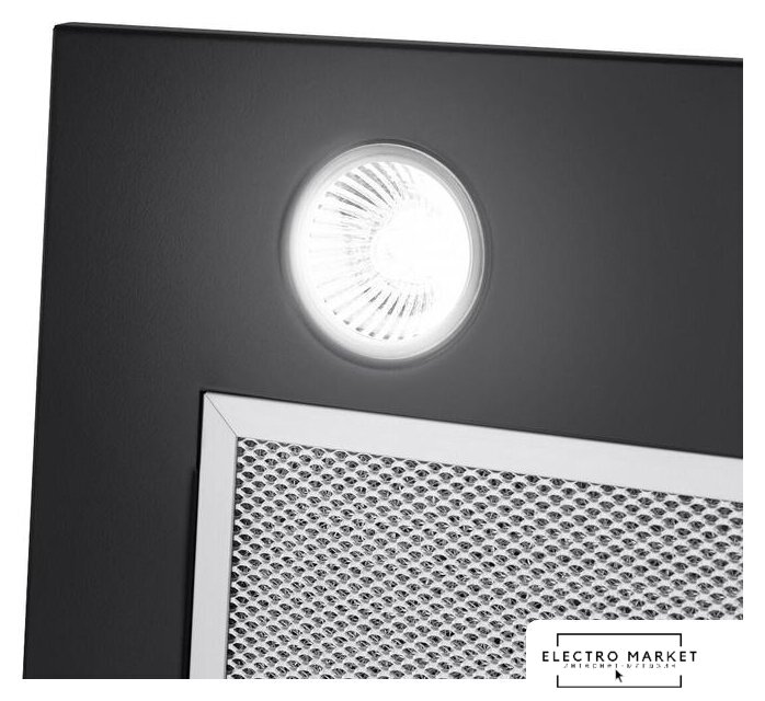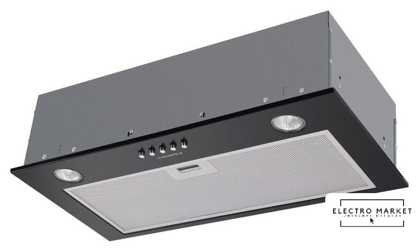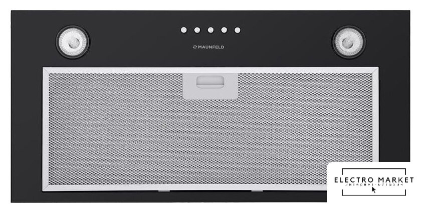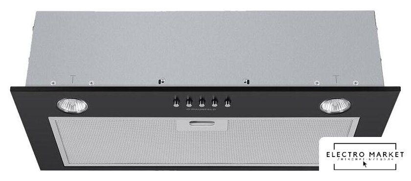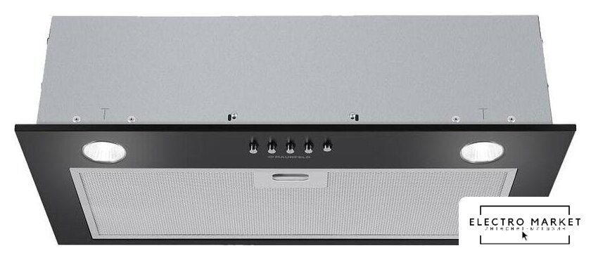 конструкция скрытая, монтаж для встраивания, ширина 59.8 см, управление механическое/кнопочное, производительность мотора 850 м³/ч, цвет черный