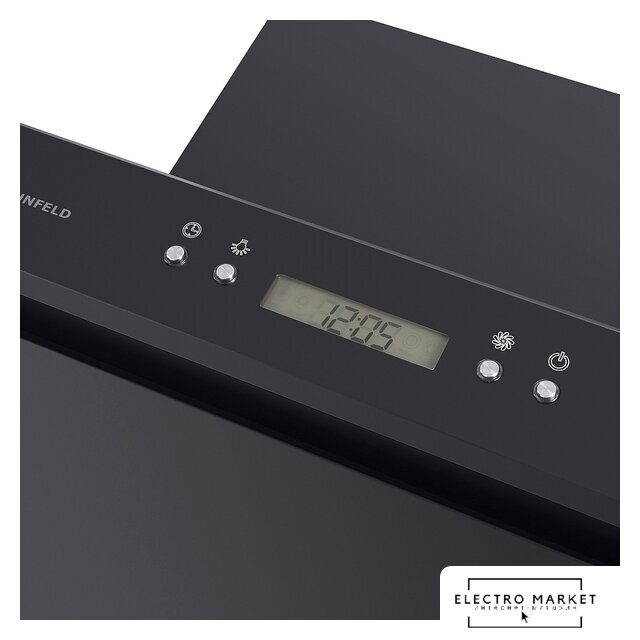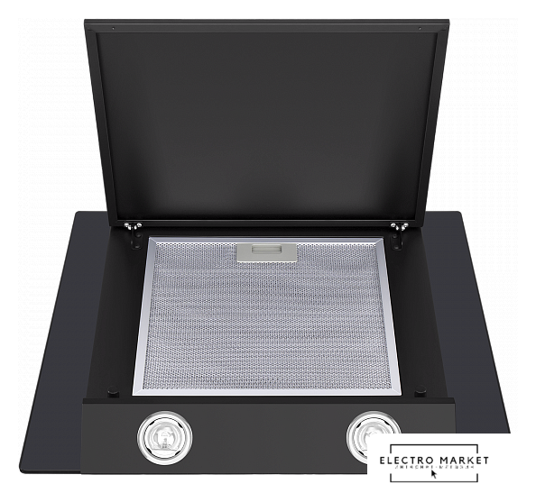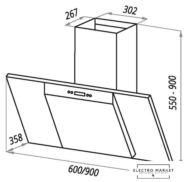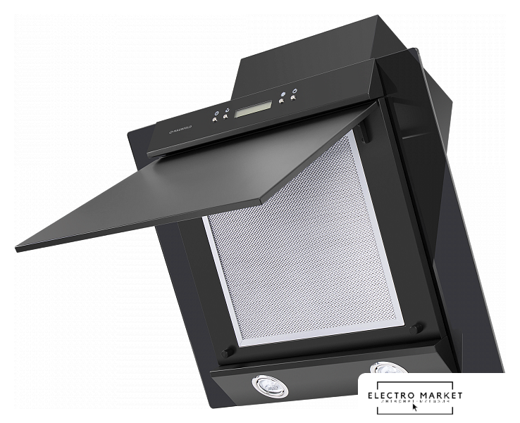 конструкция наклонная, монтаж настенный, ширина 90 см, управление механическое/кнопочное, производительность мотора 550 м³/ч, цвет черный