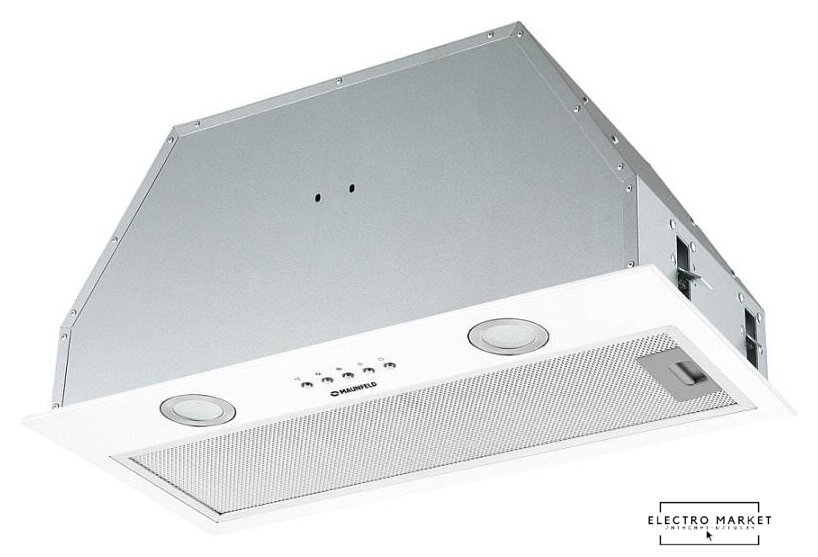 конструкция скрытая, монтаж для встраивания, ширина 59.8 см, управление механическое/кнопочное, производительность мотора 1050 м³/ч, цвет белый