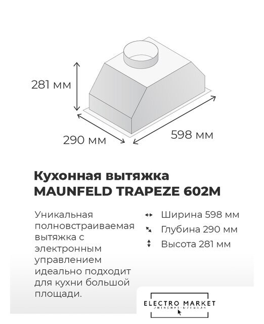 конструкция наклонная, монтаж настенный, ширина 59.8 см, управление механическое/кнопочное, производительность мотора 1030 м³/ч, цвет черный