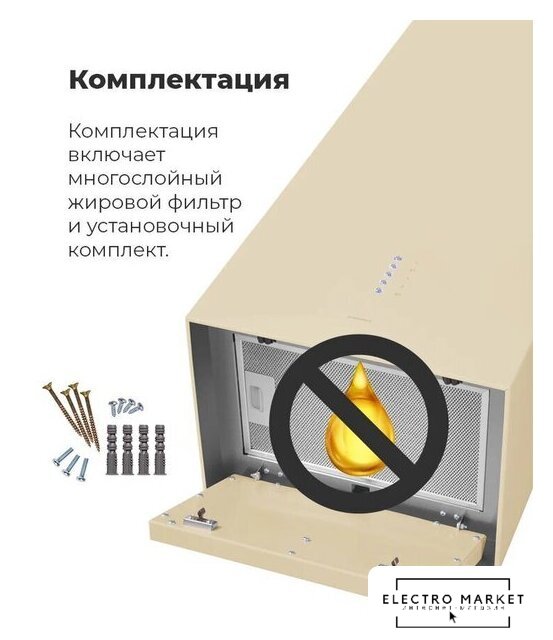 конструкция наклонная, монтаж настенный, ширина 59 см, управление сенсорное, производительность вытяжки 430 м³/ч, цвет белый