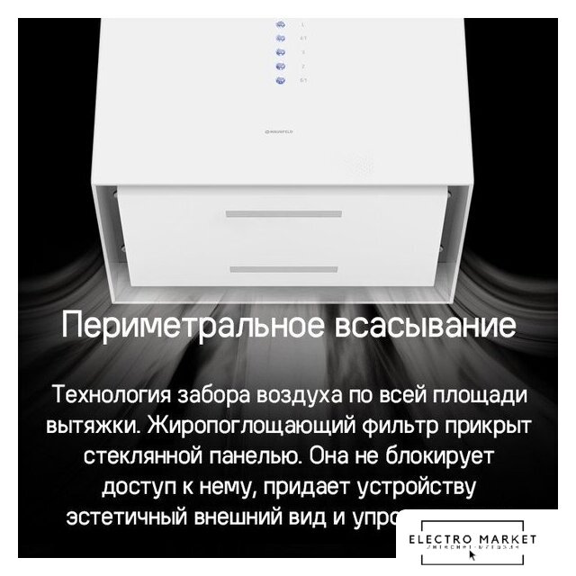 конструкция коробчатая, монтаж настенный, ширина 38.5 см, управление сенсорное, производительность мотора 1270 м³/ч, цвет белый
