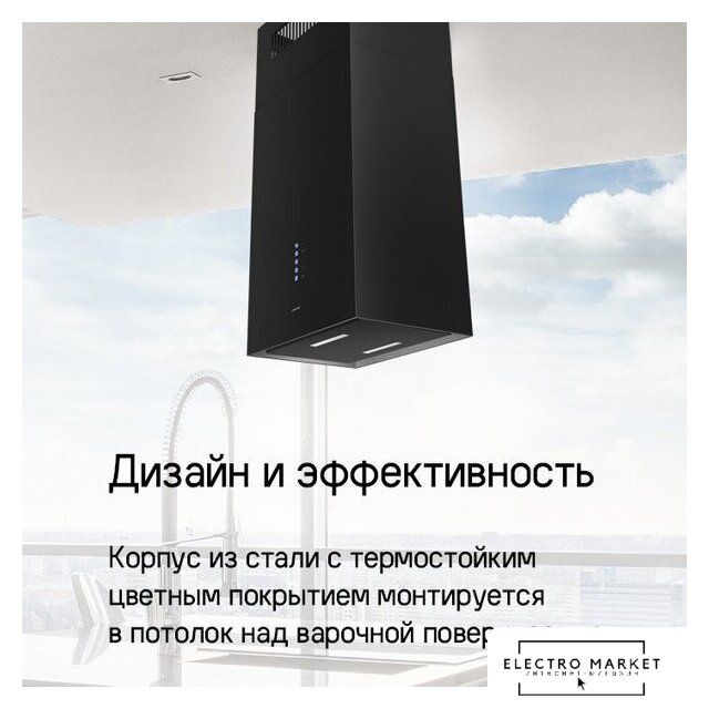 конструкция Т-образная, монтаж настенный, ширина 90 см, управление сенсорное, производительность вытяжки 531 м³/ч, цвет черный