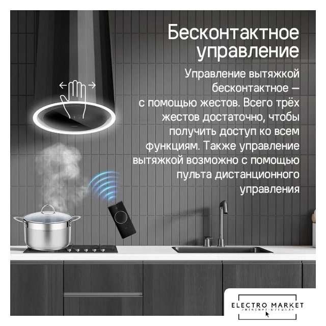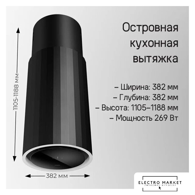 конструкция коробчатая, монтаж островной, ширина 38 см, управление сенсорное, производительность мотора 1270 м³/ч, цвет черный