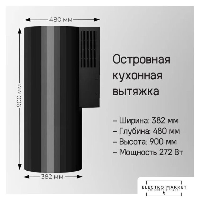 конструкция коробчатая, монтаж островной, ширина 40 см, управление сенсорное, производительность мотора 1200 м³/ч, цвет черный