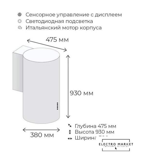 конструкция наклонная, монтаж настенный, ширина 600 см, управление сенсорное/дистанционное, производительность мотора 1250 м³/ч, цвет черный
