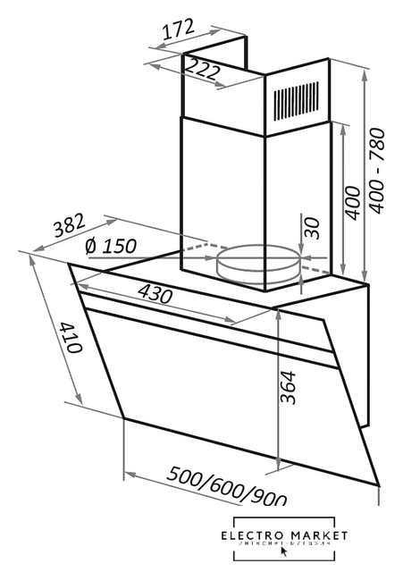 конструкция купольная, монтаж настенный, управление механическое/слайдерное, производительность мотора 650 м³/ч, ширина 60 см
