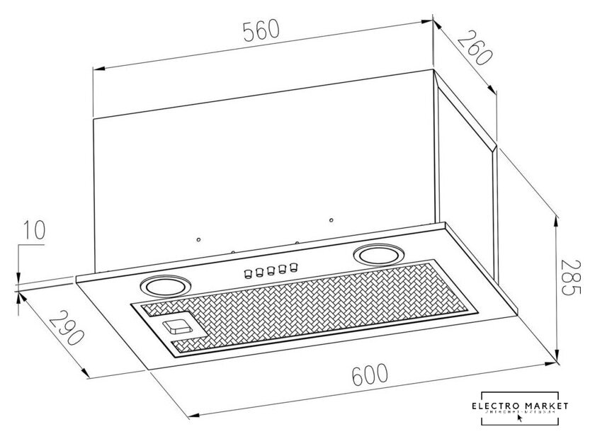 конструкция наклонная, монтаж настенный, ширина 59.5 см, управление механическое/кнопочное, производительность мотора 700 м³/ч, цвет черный