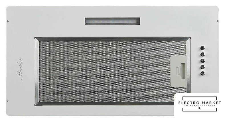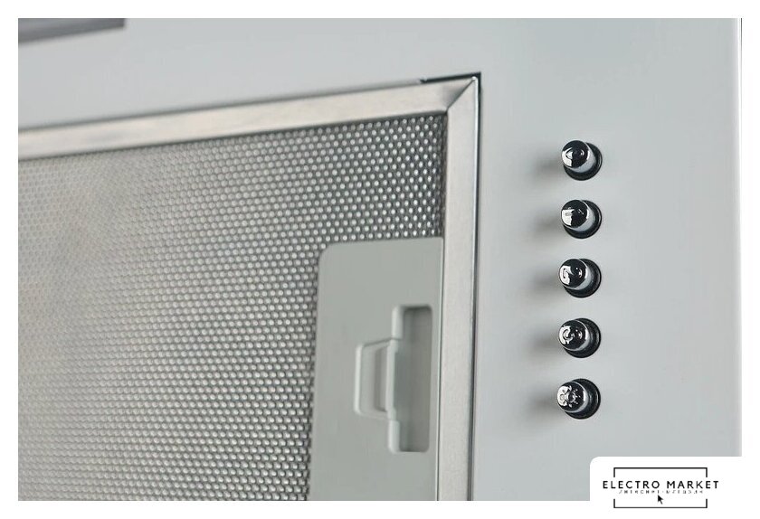 конструкция скрытая, монтаж для встраивания, ширина 52.5 см, управление механическое/кнопочное, производительность мотора 1300 м³/ч, цвет нержавеющая сталь