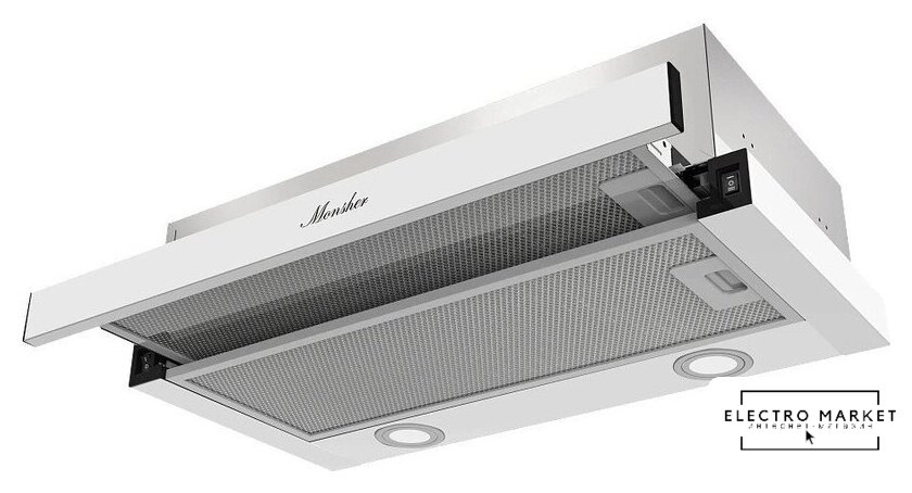 конструкция коробчатая, монтаж для встраивания, управление механическое, производительность мотора 450 м³/ч, ширина 52 см