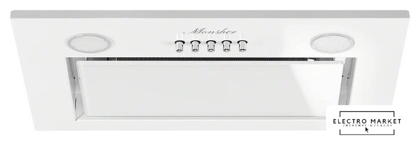 конструкция скрытая, монтаж для встраивания, ширина 53.5 см, управление механическое/кнопочное, производительность мотора 750 м³/ч, цвет белый