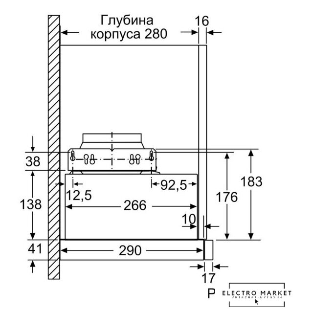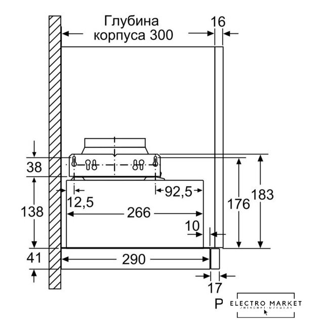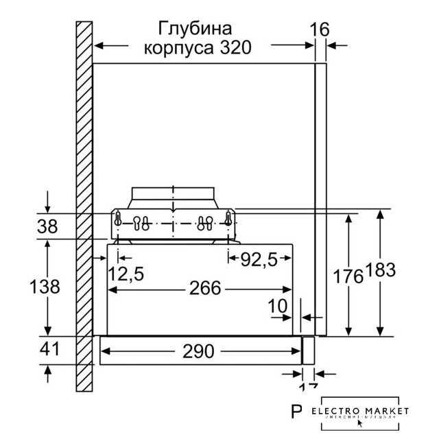 конструкция коробчатая, монтаж настенный, ширина 38.7 см, управление механическое/кнопочное, производительность мотора 1000 м³/ч, цвет черный