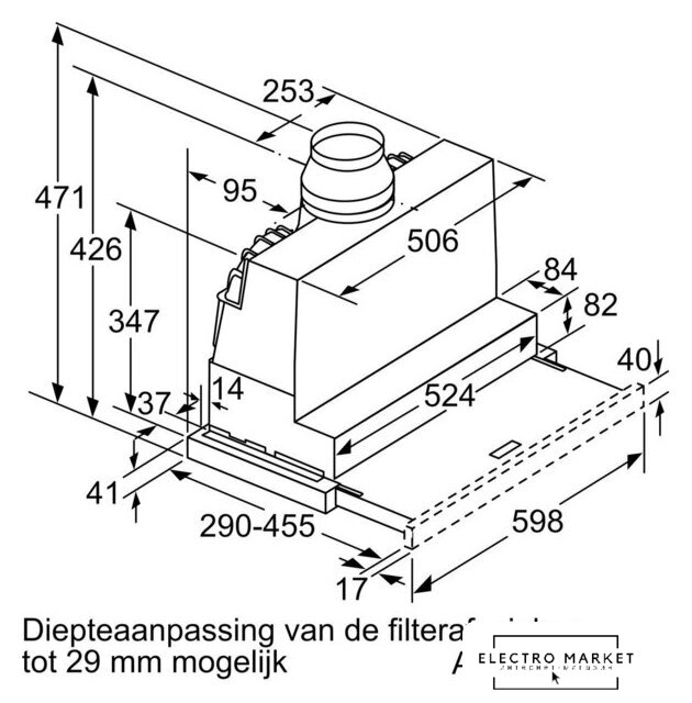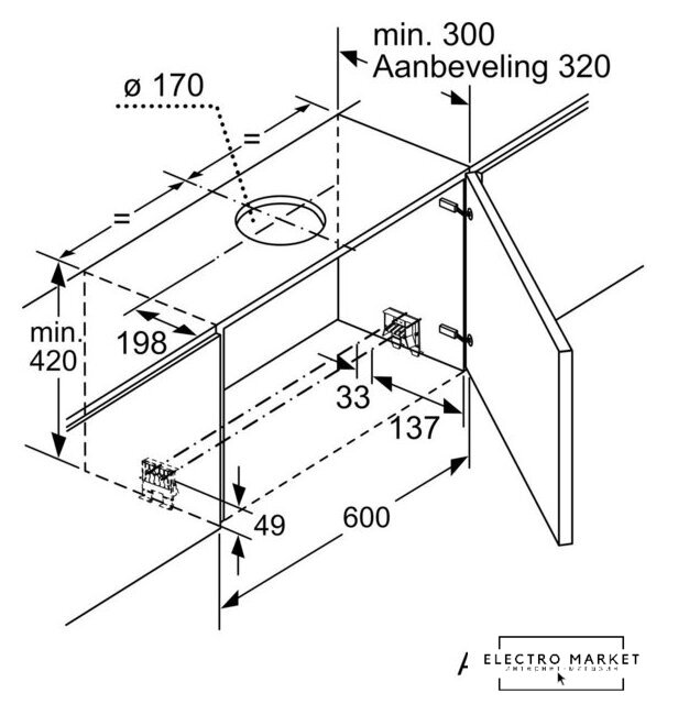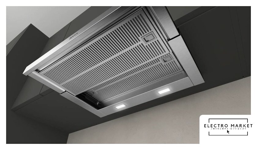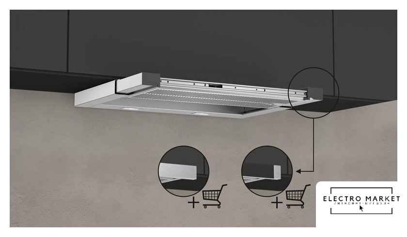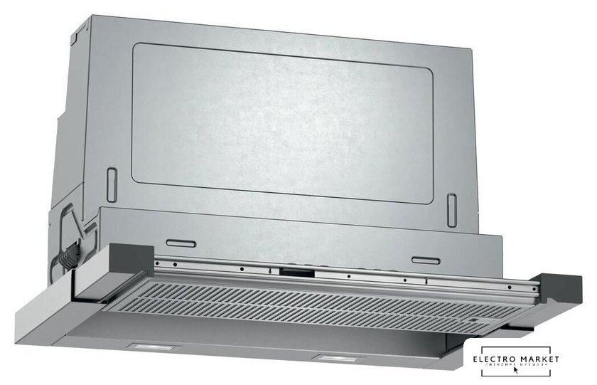 конструкция коробчатая, монтаж настенный, ширина 59.8 см, управление электронное/кнопочное, производительность вытяжки 415 м³/ч, производительность мотора 1200 м³/ч
