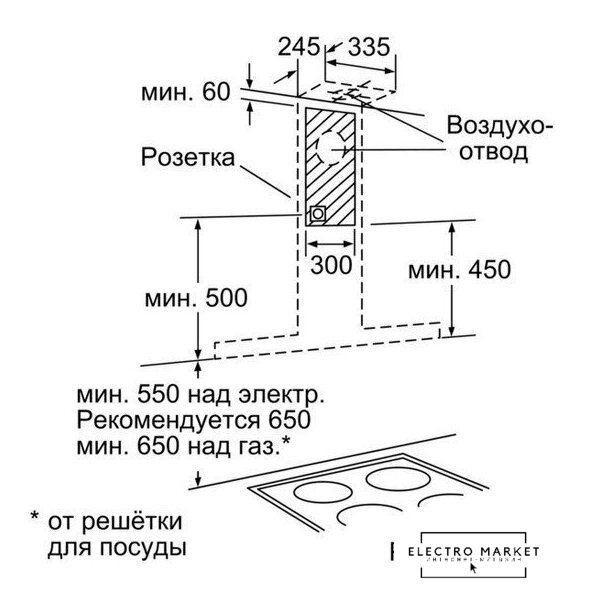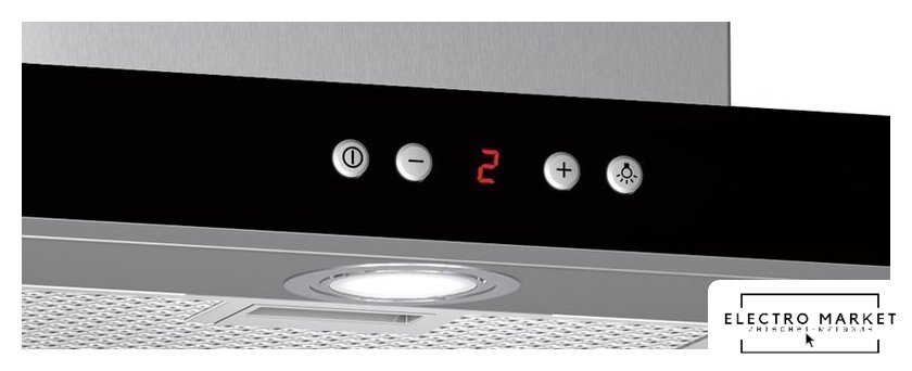 конструкция Т-образная, монтаж настенный, ширина 60 см, управление электронное, производительность мотора 650 м³/ч, цвет нержавеющая сталь