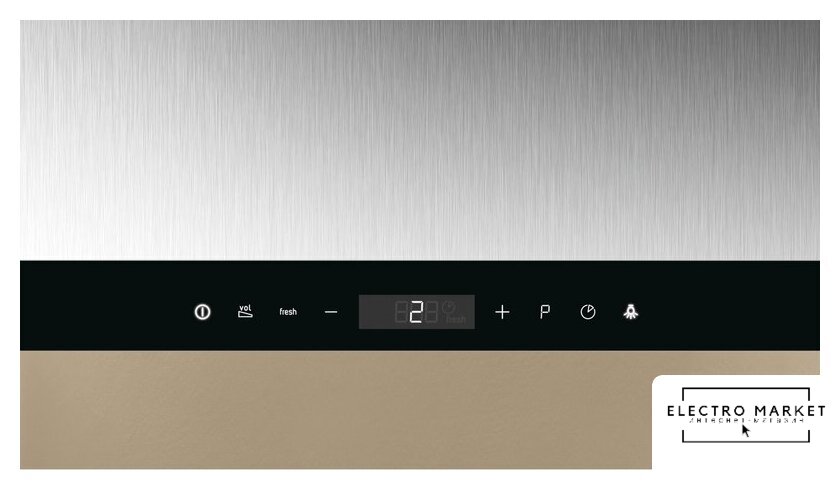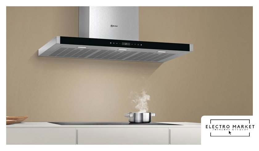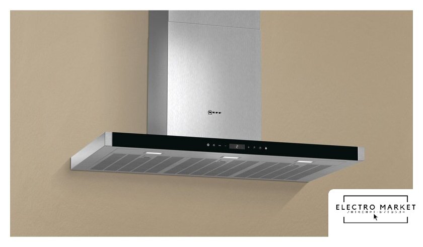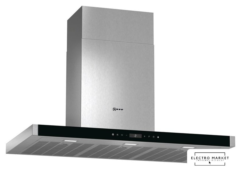 конструкция Т-образная, монтаж настенный, ширина 90 см, управление электронное/кнопочное, производительность вытяжки 460 м³/ч, цвет нержавеющая сталь/черный