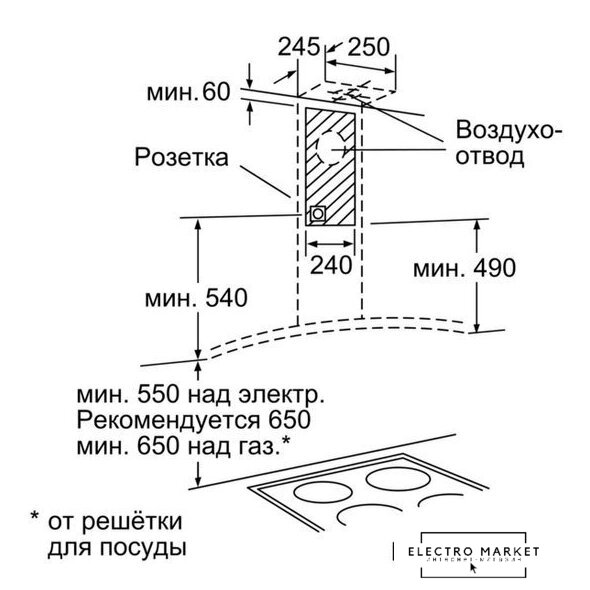 конструкция Т-образная, монтаж настенный, ширина 60 см, управление электронное, производительность мотора 690 м³/ч, цвет нержавеющая сталь
