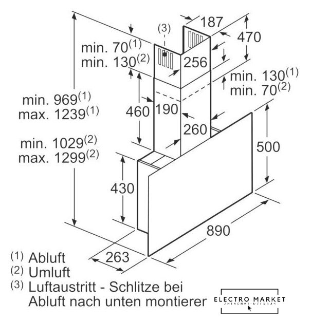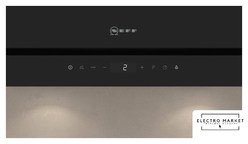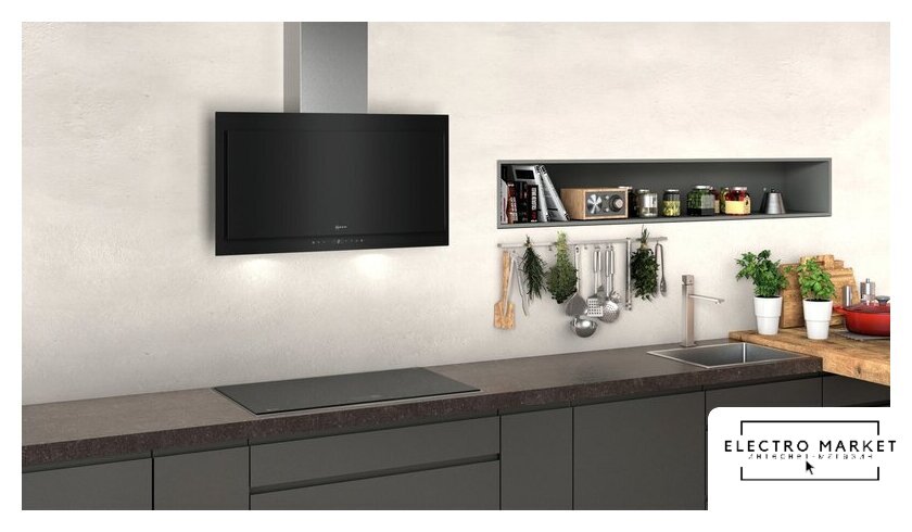 конструкция Т-образная, монтаж настенный, ширина 90 см, управление электронное, производительность мотора 650 м³/ч, цвет нержавеющая сталь