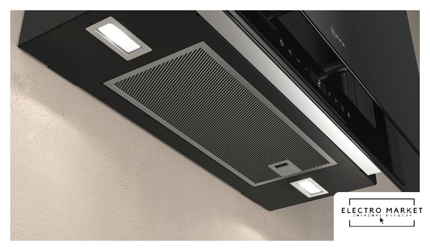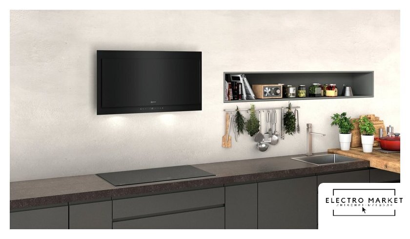 конструкция коробчатая, монтаж настенный, ширина 89 см, управление сенсорное, производительность вытяжки 420 м³/ч, цвет нержавеющая сталь/черный
