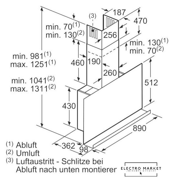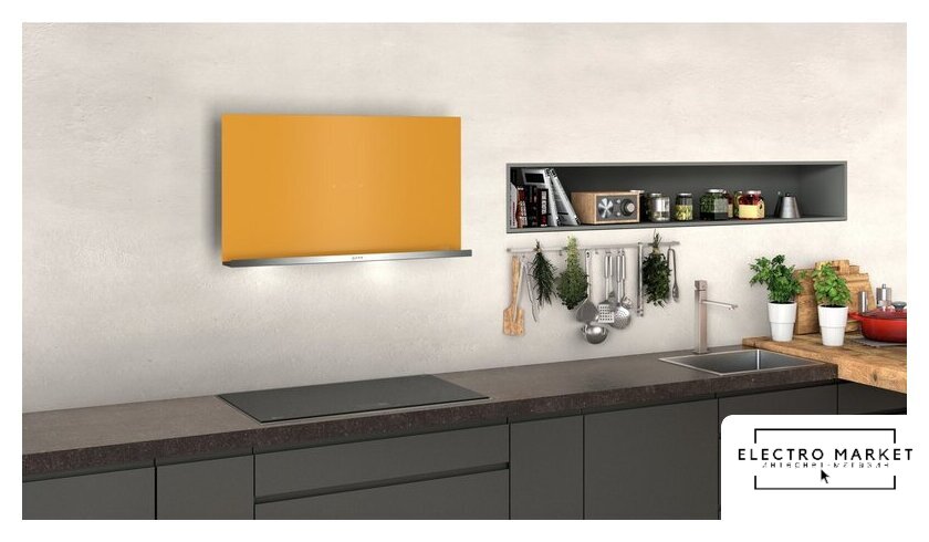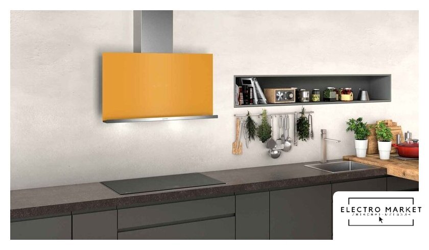 конструкция Т-образная, монтаж настенный, ширина 90 см, управление электронное, производительность мотора 650 м³/ч, цвет нержавеющая сталь