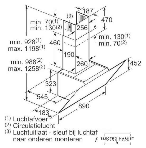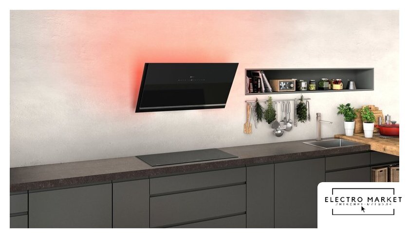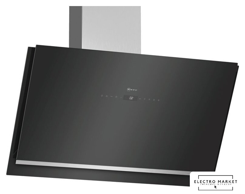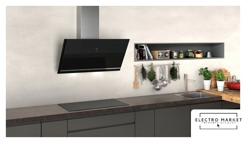 конструкция Т-образная, монтаж настенный, ширина 90 см, управление электронное/кнопочное, производительность вытяжки 460 м³/ч, цвет нержавеющая сталь/черный
