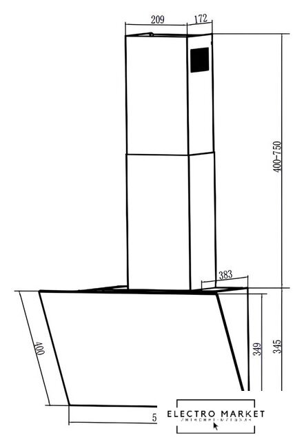 конструкция наклонная, монтаж настенный, ширина 59.8 см, управление механическое/кнопочное, производительность мотора 400 м³/ч, цвет нержавеющая сталь/черный