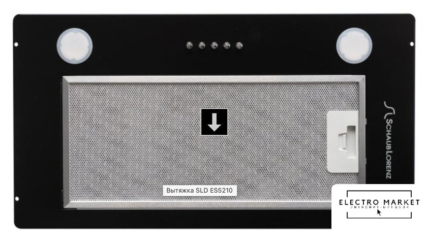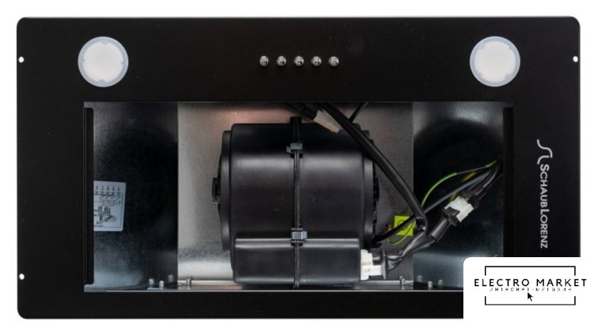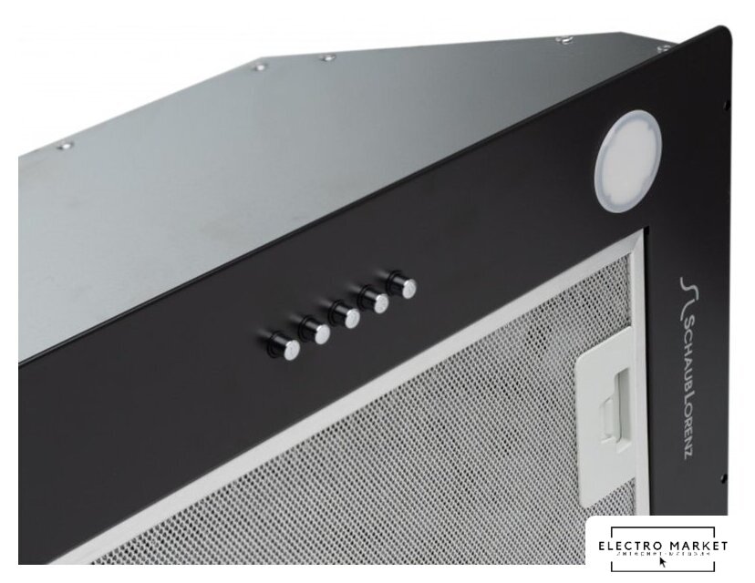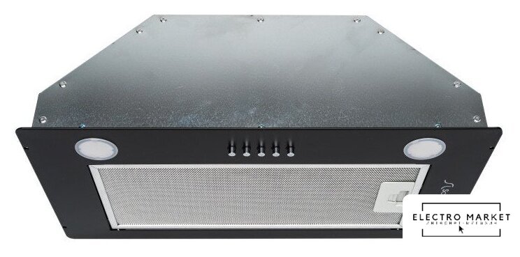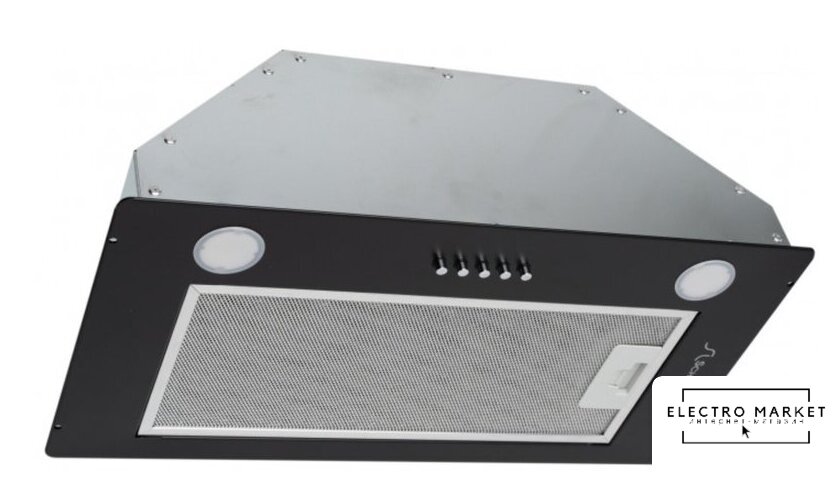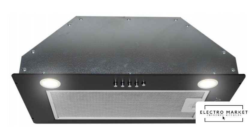конструкция скрытая, монтаж для встраивания, ширина 52 см, управление механическое/кнопочное, производительность вытяжки 850 м³/ч, производительность мотора 1050 м³/ч, цвет черный