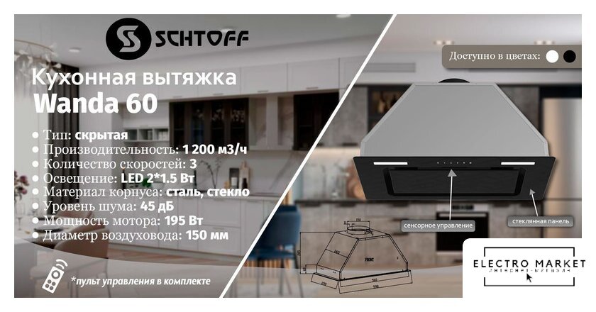 конструкция наклонная, монтаж настенный, ширина 60 см, управление сенсорное, производительность мотора 1260 м³/ч, цвет белый