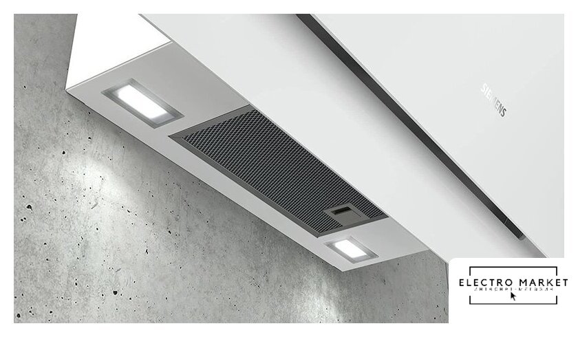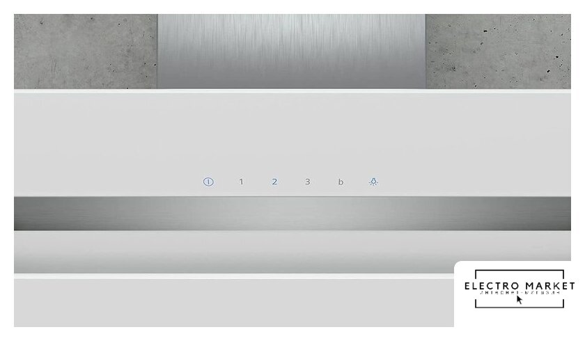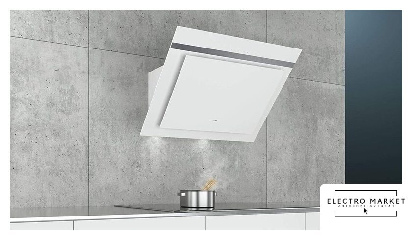 конструкция наклонная, монтаж настенный, ширина 55 см, управление электронное/кнопочное, производительность вытяжки 650 м³/ч, производительность мотора 1200 м³/ч, цвет белый
