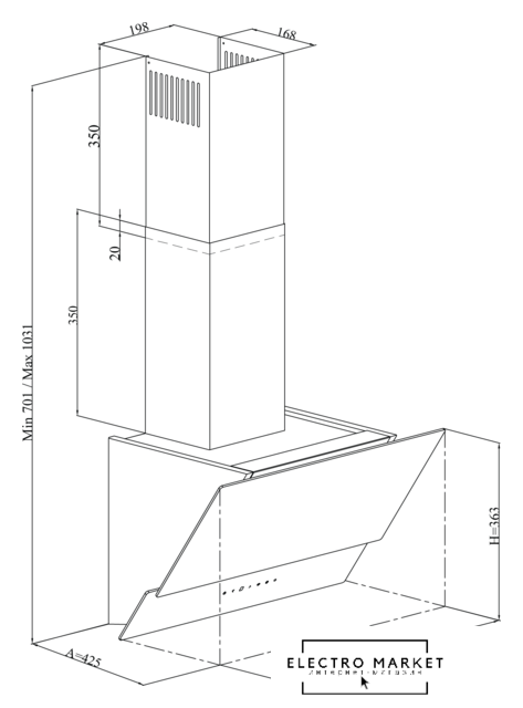 конструкция Т-образная, монтаж настенный, ширина 59 см, управление механическое/кнопочное, производительность мотора 430 м³/ч, цвет нержавеющая сталь