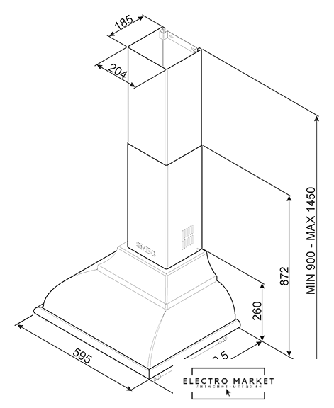 конструкция купольная, монтаж настенный, управление механическое/поворотный переключатель, производительность вытяжки 630 м³/ч, ширина 89.6 см