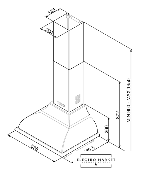 конструкция купольная, монтаж настенный, управление поворотный переключатель, производительность мотора 820 м³/ч, ширина 90 см