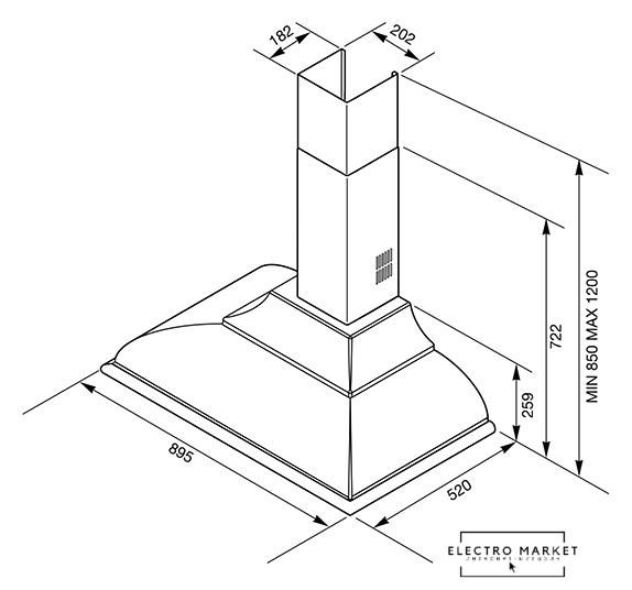 конструкция коробчатая, монтаж настенный, ширина 32 см, управление электронное/кнопочное, производительность вытяжки 410 м³/ч, производительность мотора 1200 м³/ч, цвет белый