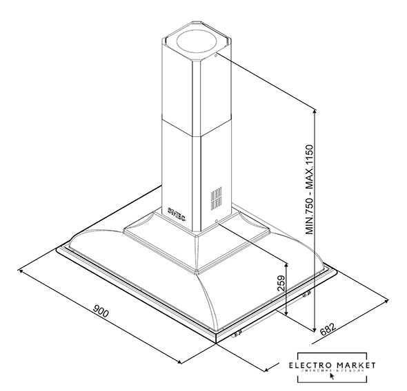 конструкция коробчатая, монтаж настенный, ширина 59.8 см, управление электронное/кнопочное, производительность мотора 1200 м³/ч, цвет черный